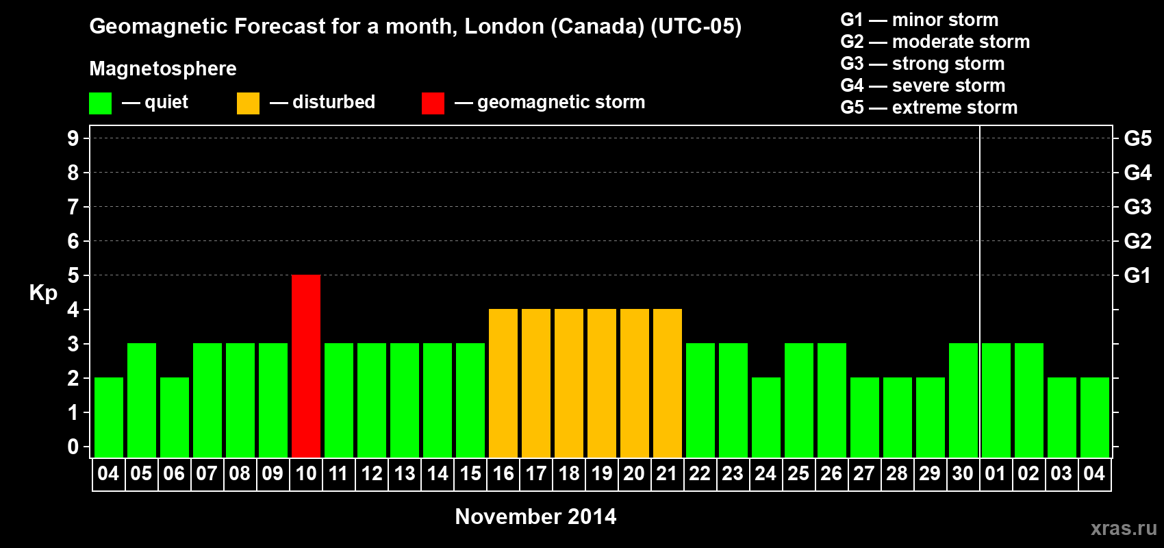 Geomagnetic storm forecast in London (Canada) for Nov 04, 2014