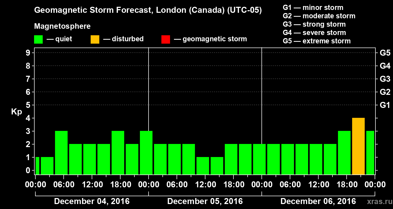 Geomagnetic storm forecast in London (Canada) for Dec 04, 2016