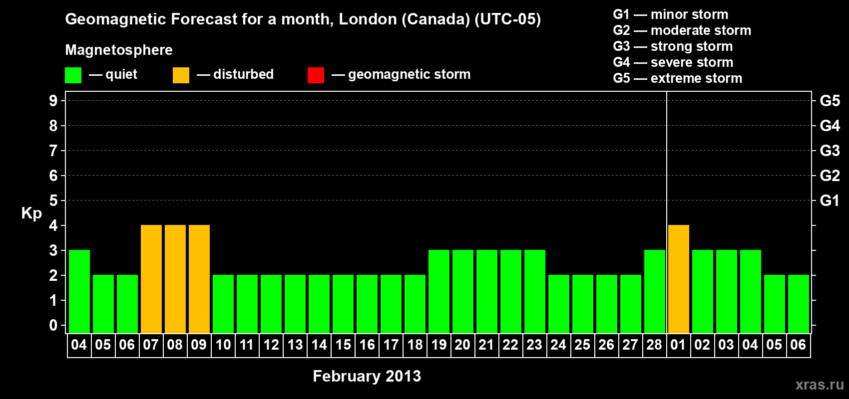 Geomagnetic storm forecast in London (Canada) for Feb 04, 2013