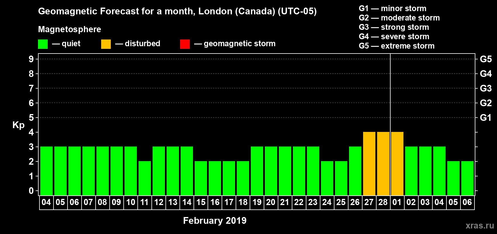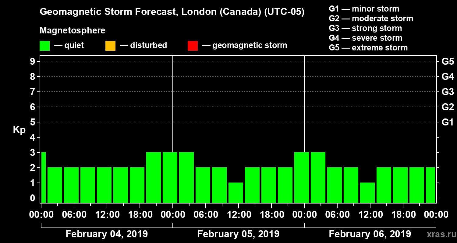 Geomagnetic storm forecast in London (Canada) for Feb 04, 2019
