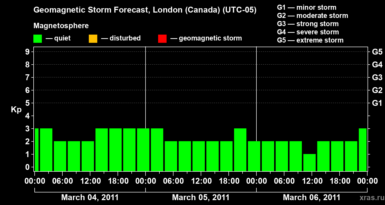 Geomagnetic storm forecast in London (Canada) for Mar 04, 2011