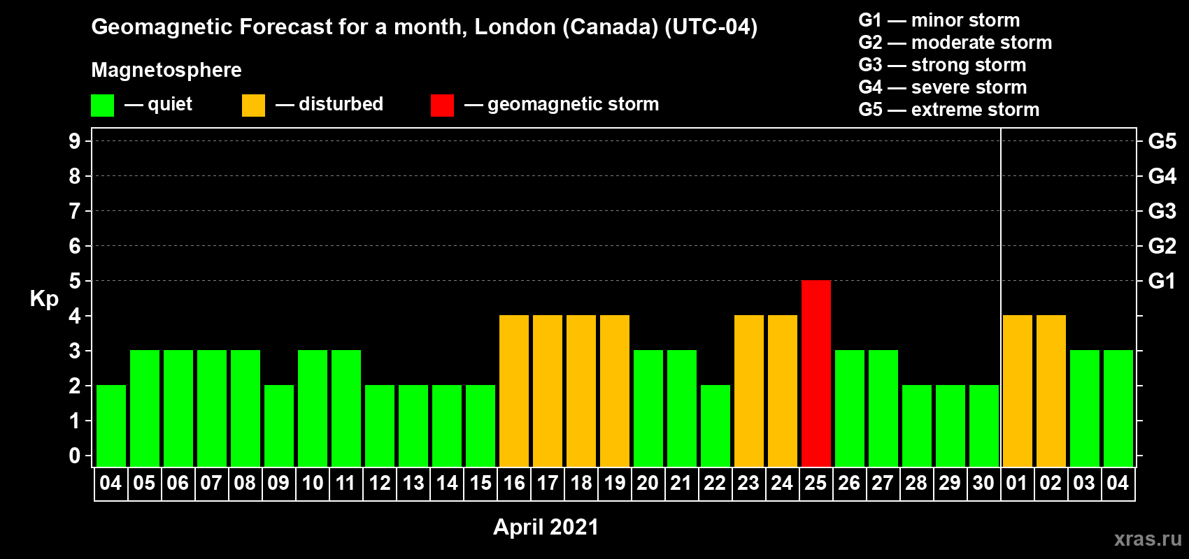 Geomagnetic storm forecast in London (Canada) for Apr 04, 2021