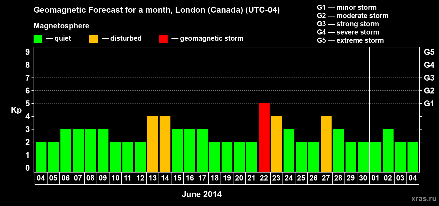 Geomagnetic storm forecast in London (Canada) for Jun 04, 2014