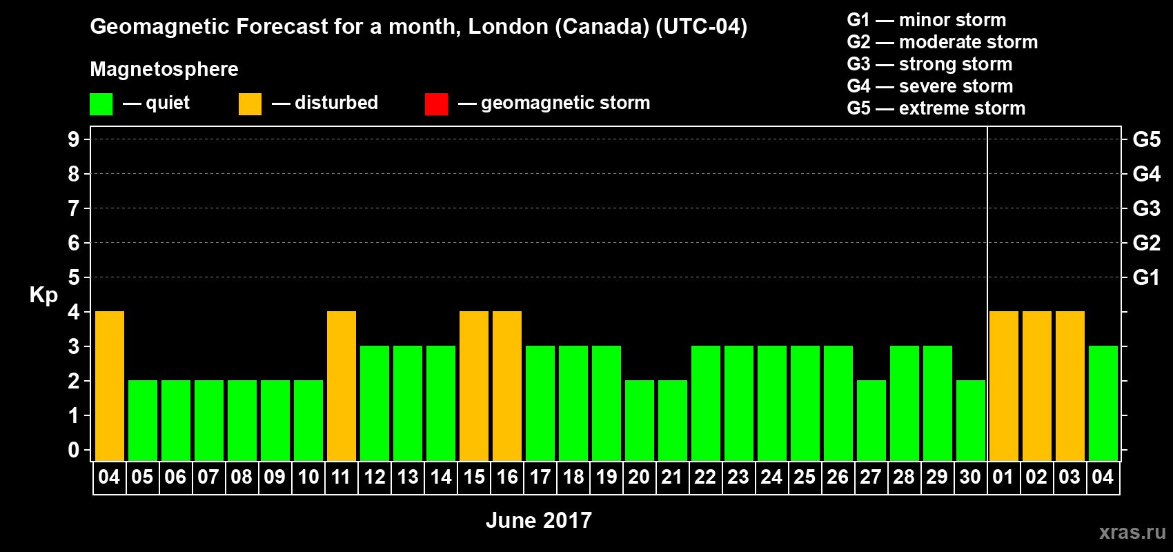 Geomagnetic storm forecast in London (Canada) for Jun 04, 2017