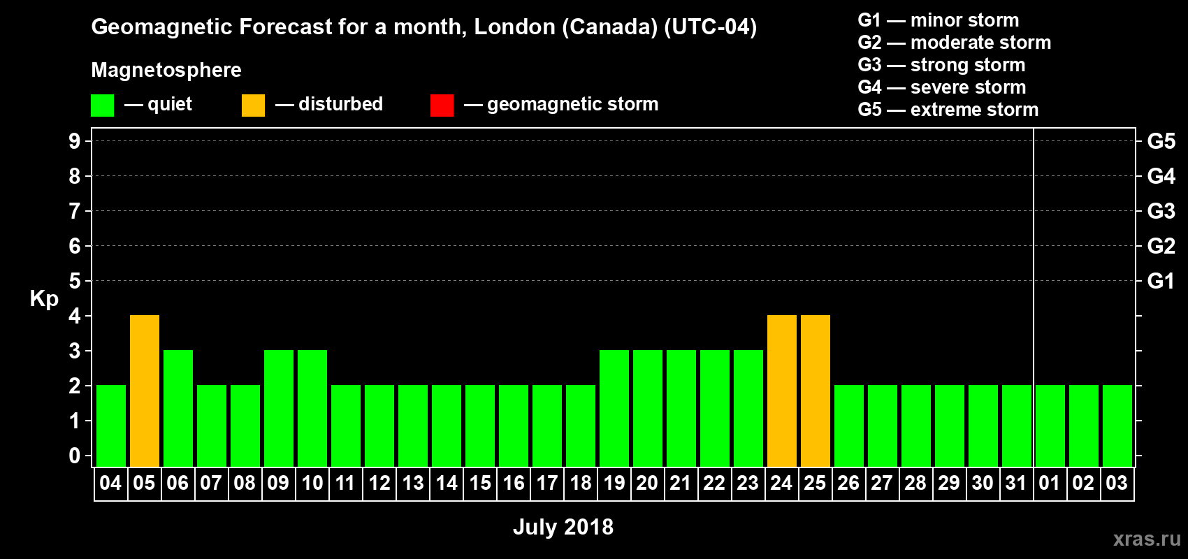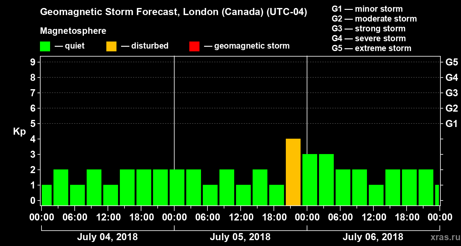 Geomagnetic storm forecast in London (Canada) for Jul 04, 2018
