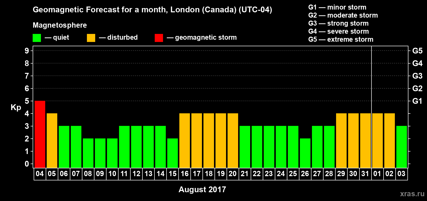 Geomagnetic storm forecast in London (Canada) for Aug 04, 2017