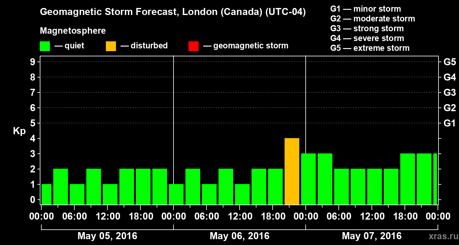 Geomagnetic storm forecast in London (Canada) for May 05, 2016