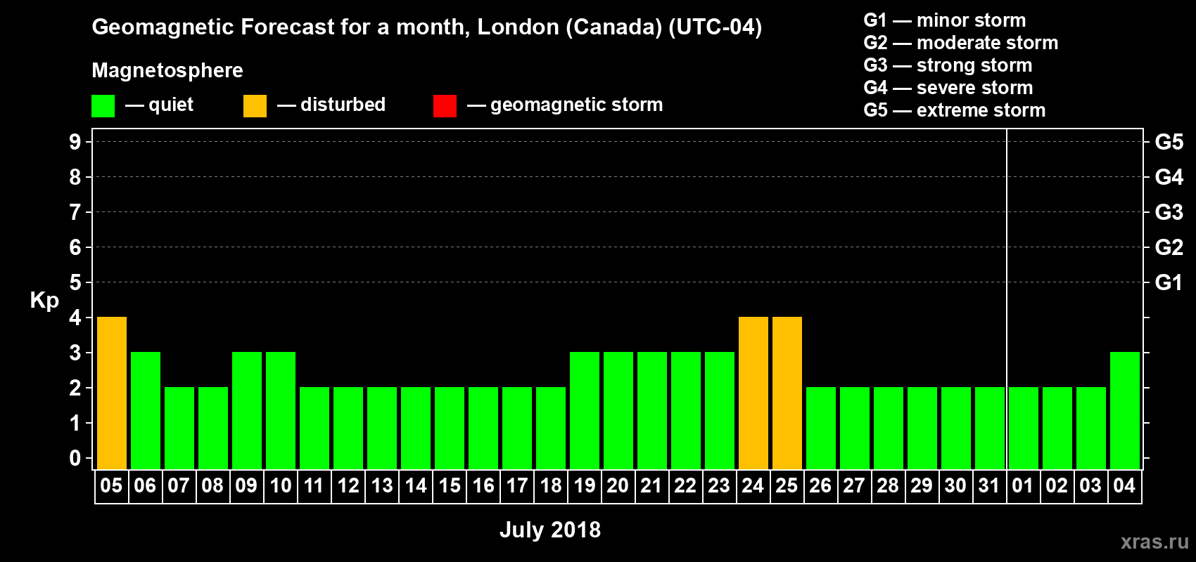 Geomagnetic storm forecast in London (Canada) for Jul 05, 2018