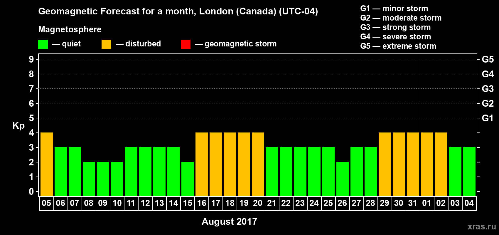 Geomagnetic storm forecast in London (Canada) for Aug 05, 2017