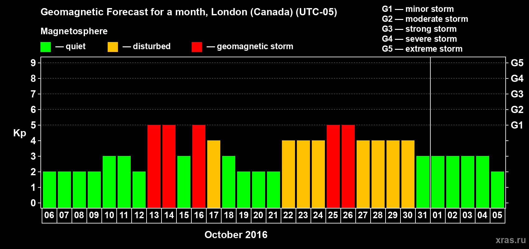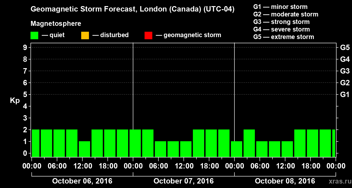 Geomagnetic storm forecast in London (Canada) for Oct 06, 2016