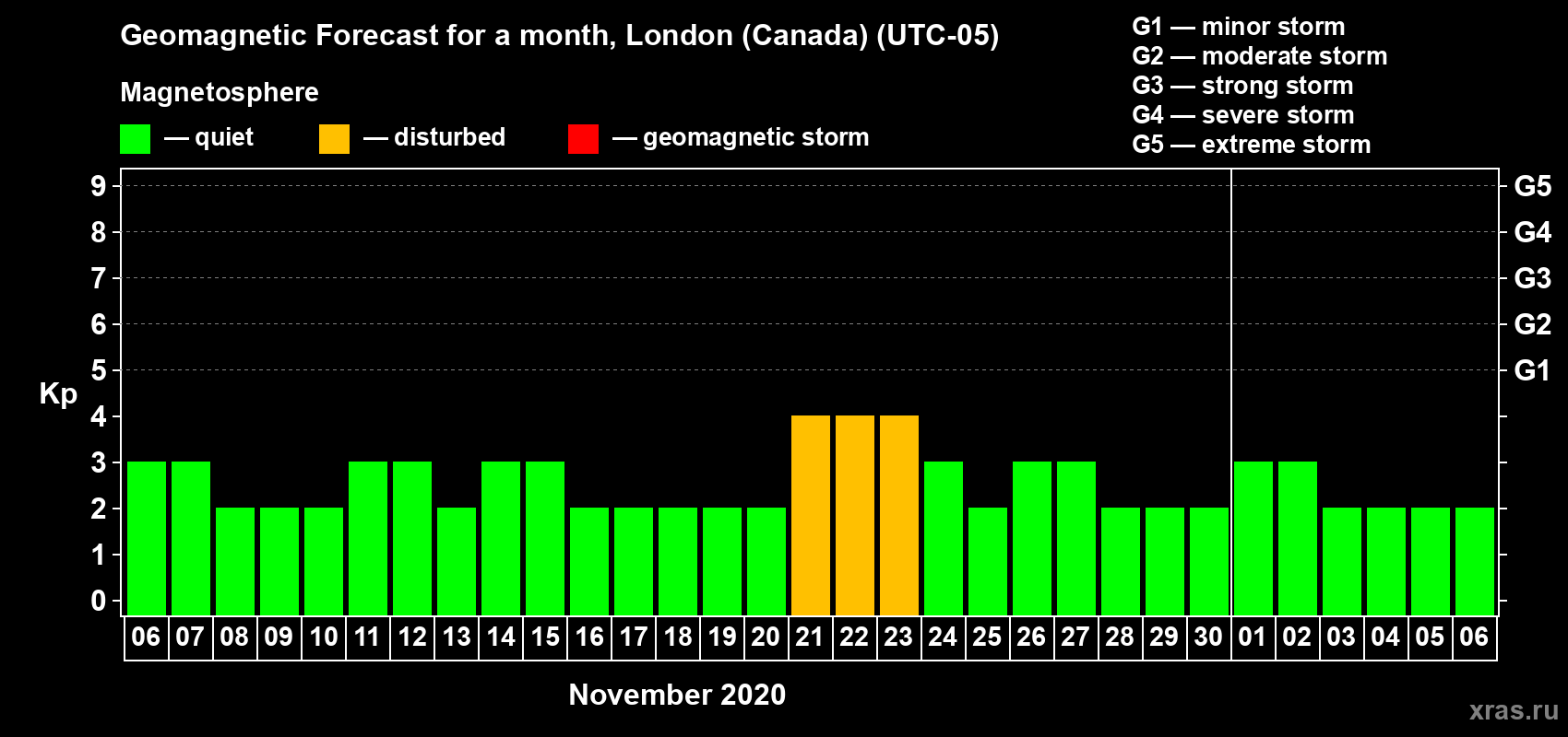Geomagnetic storm forecast in London (Canada) for Nov 06, 2020