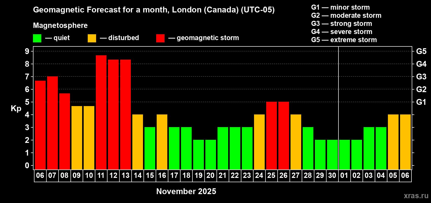 Geomagnetic storm forecast in London (Canada) for Nov 06, 2025