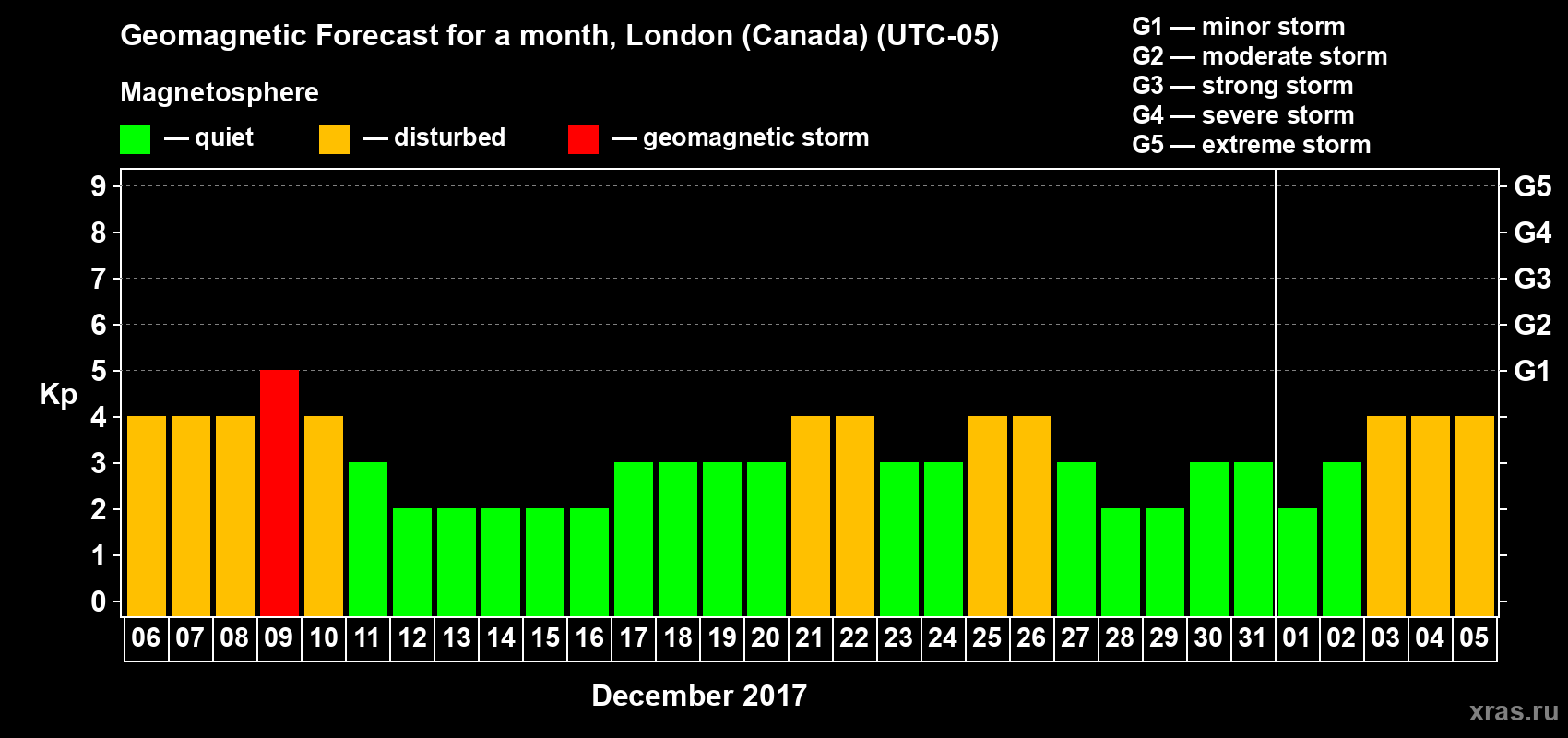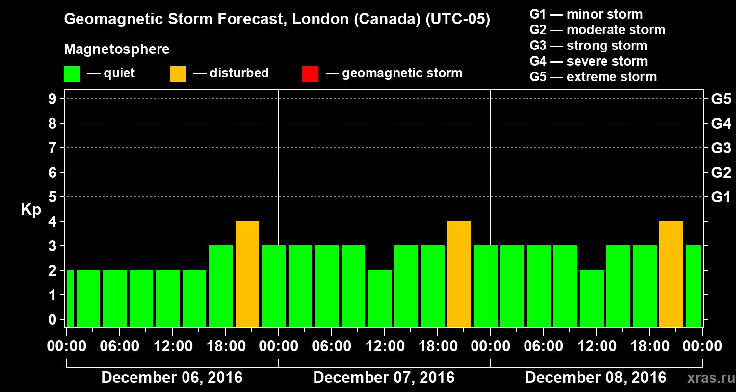 Geomagnetic storm forecast in London (Canada) for Dec 06, 2016