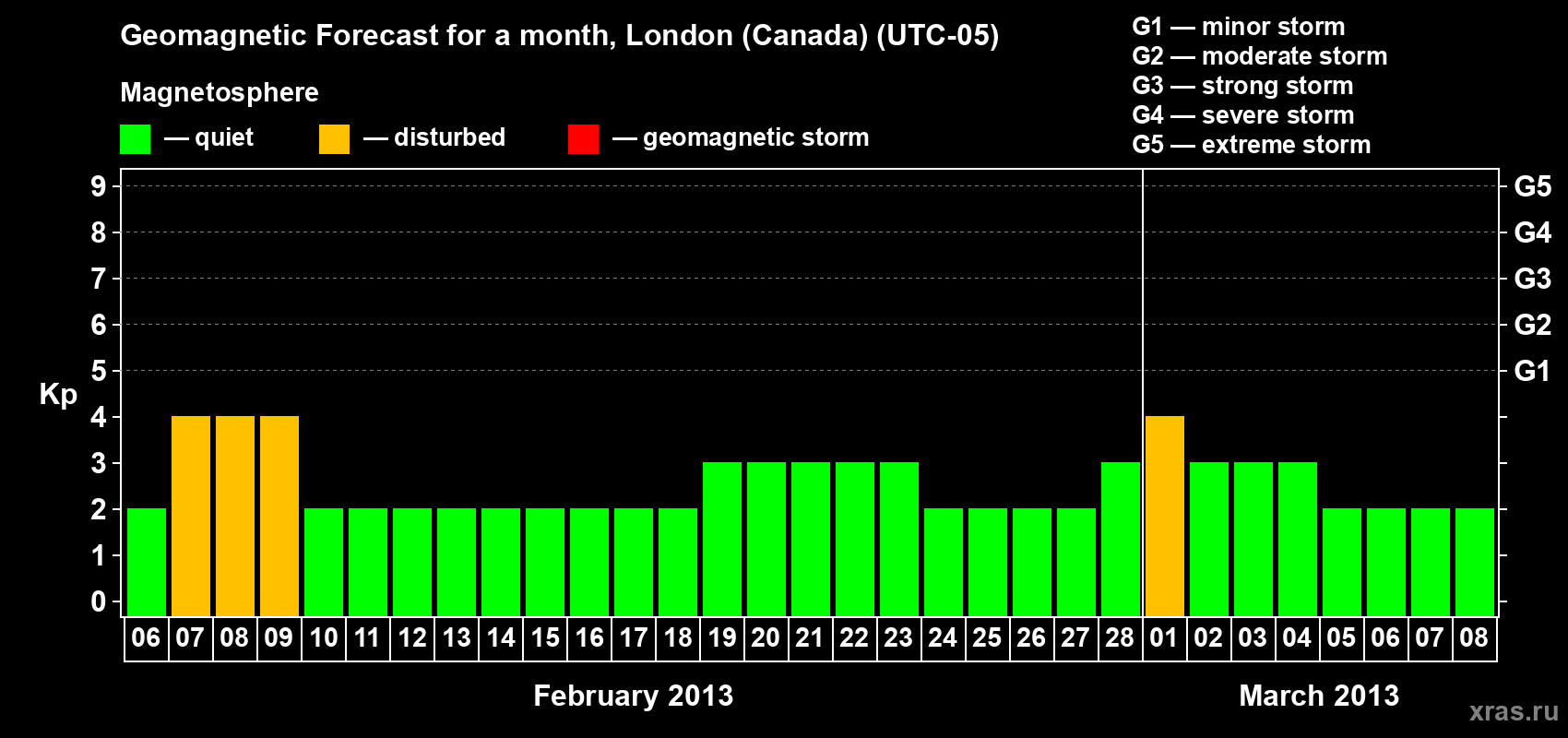 Geomagnetic storm forecast in London (Canada) for Feb 06, 2013