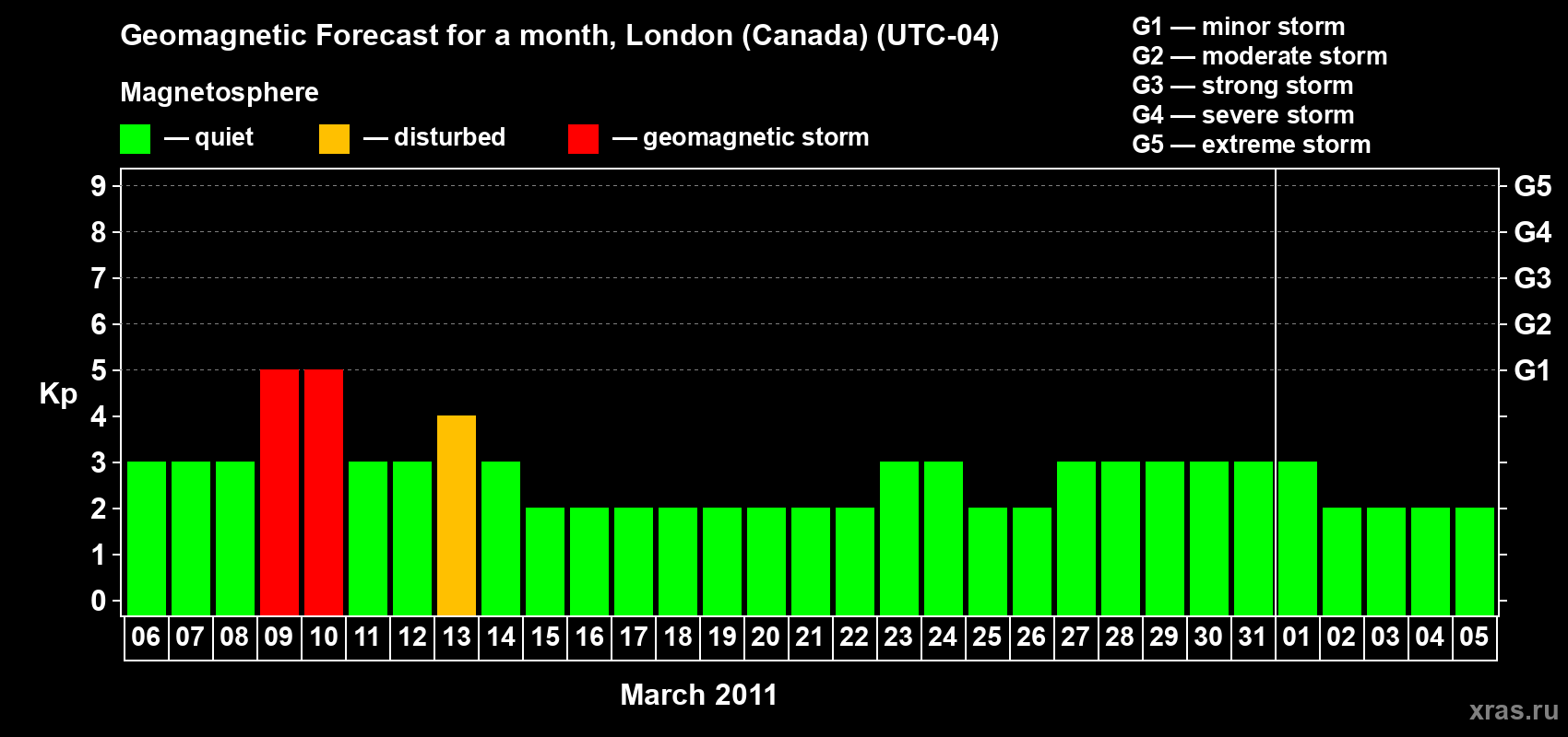 Geomagnetic storm forecast in London (Canada) for Mar 06, 2011