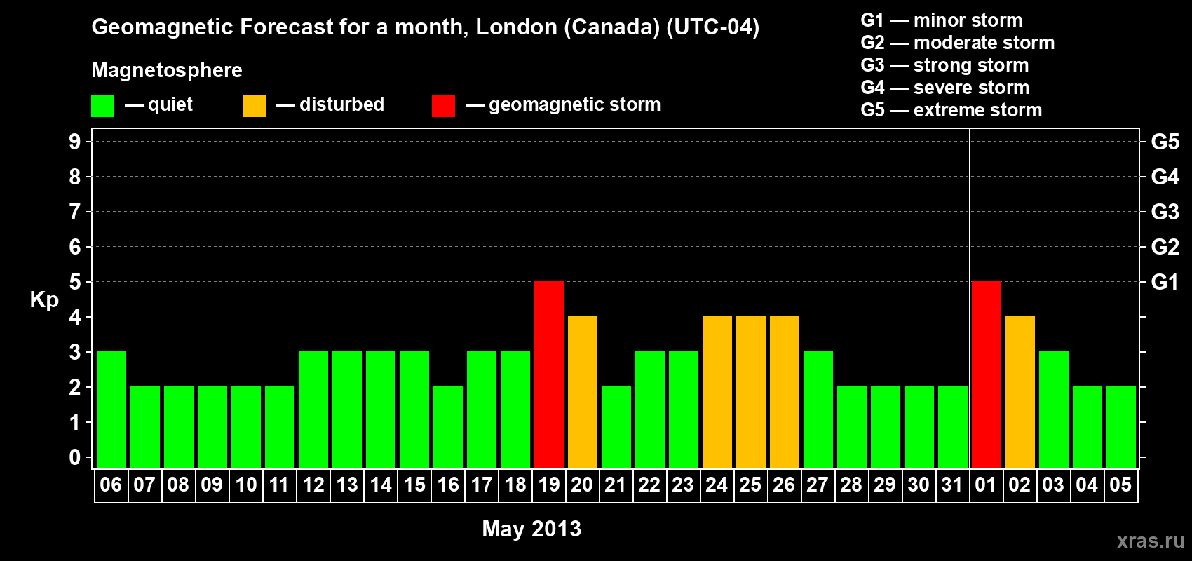 Geomagnetic storm forecast in London (Canada) for May 06, 2013
