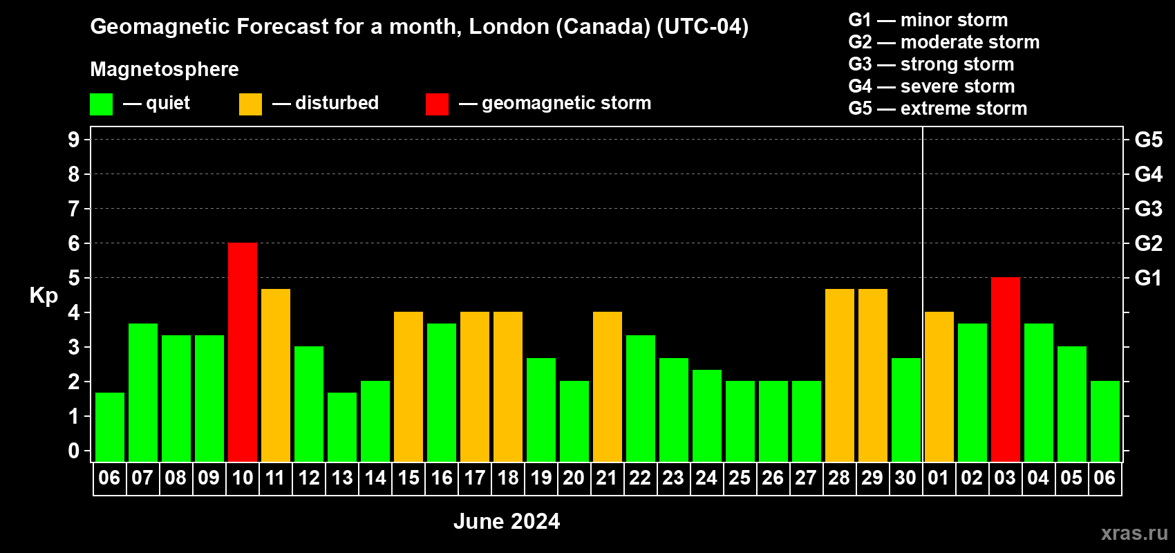 Geomagnetic storm forecast in London (Canada) for Jun 06, 2024