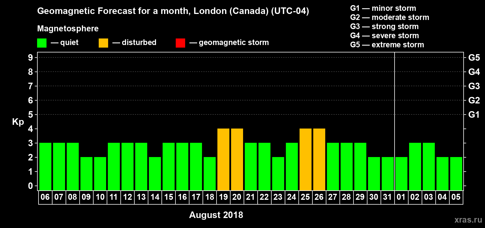 Geomagnetic storm forecast in London (Canada) for Aug 06, 2018