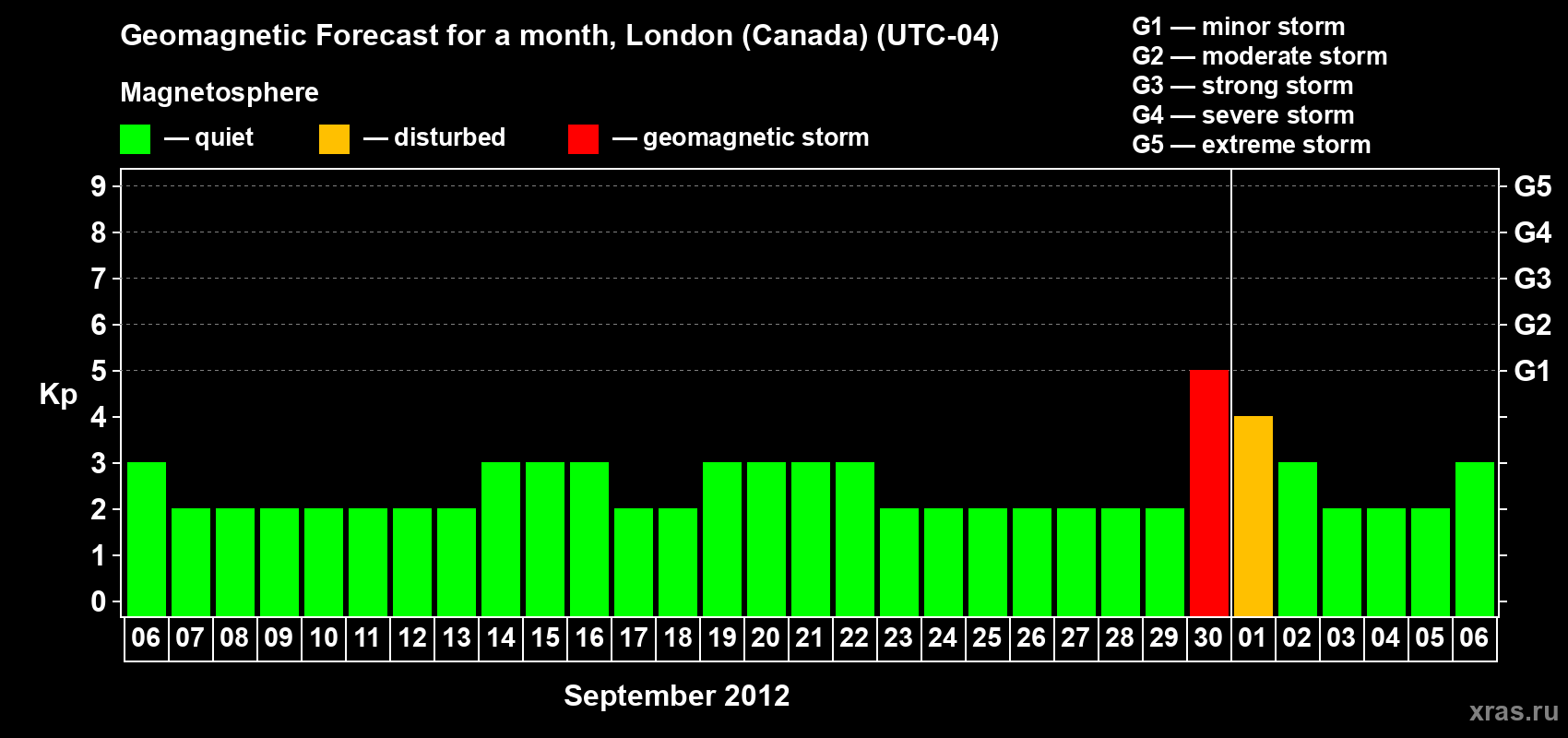 Geomagnetic storm forecast in London (Canada) for Sep 06, 2012