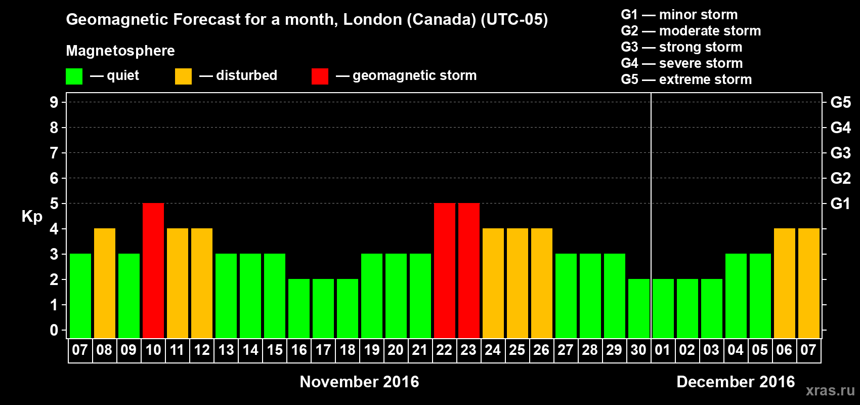 Geomagnetic storm forecast in London (Canada) for Nov 07, 2016