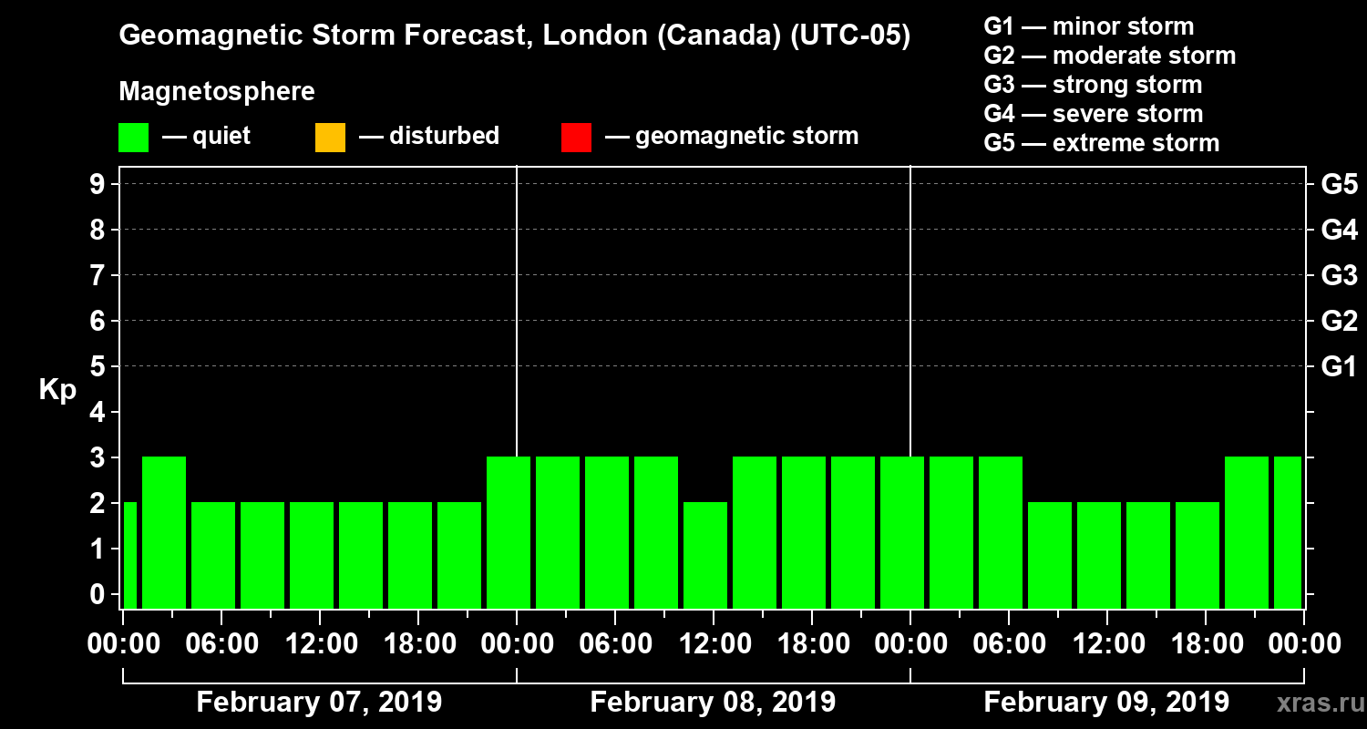 Geomagnetic storm forecast in London (Canada) for Feb 07, 2019