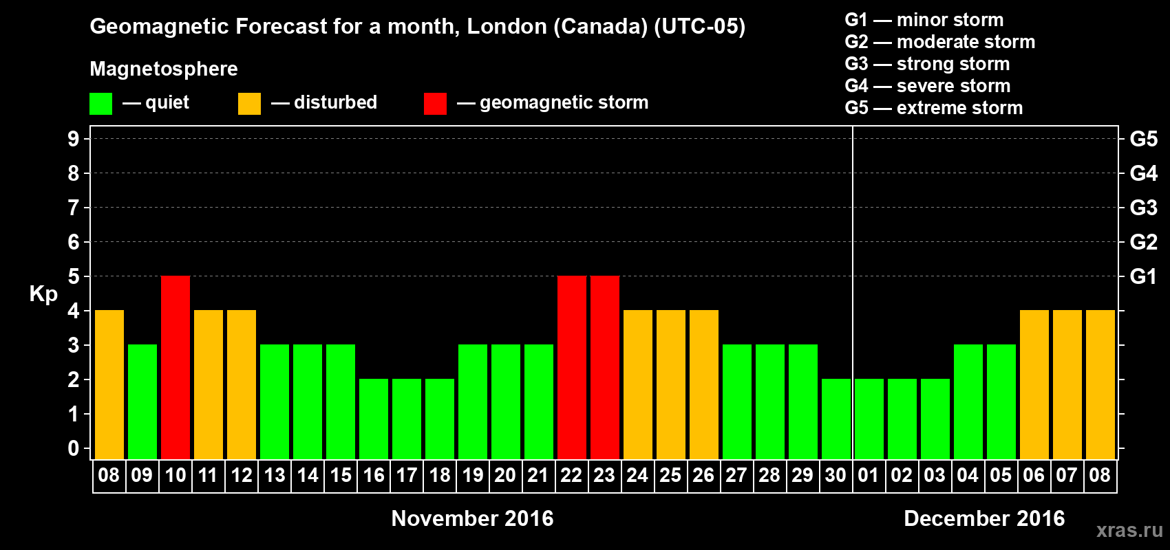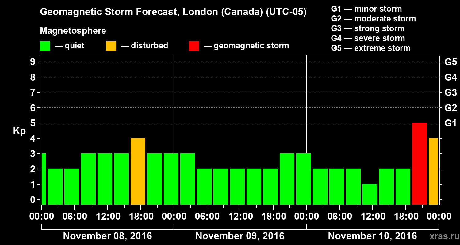 Geomagnetic storm forecast in London (Canada) for Nov 08, 2016