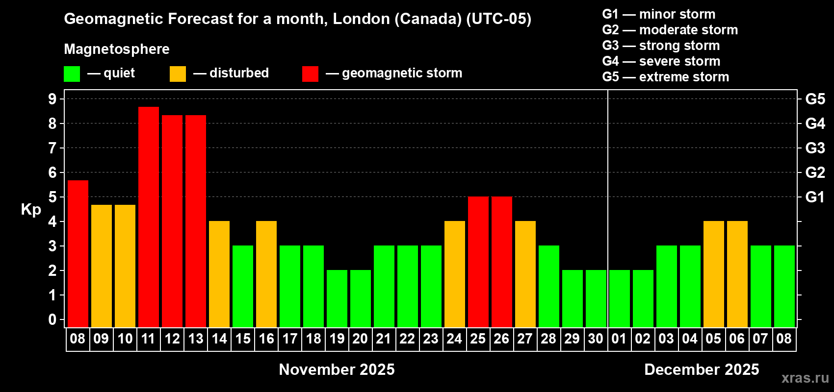Geomagnetic storm forecast in London (Canada) for Nov 08, 2025