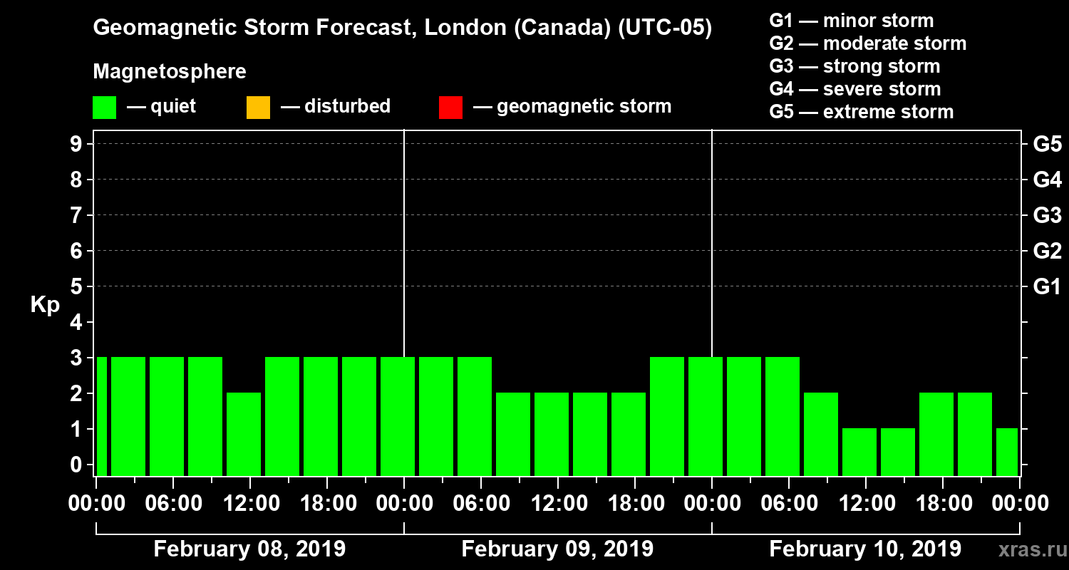 Geomagnetic storm forecast in London (Canada) for Feb 08, 2019
