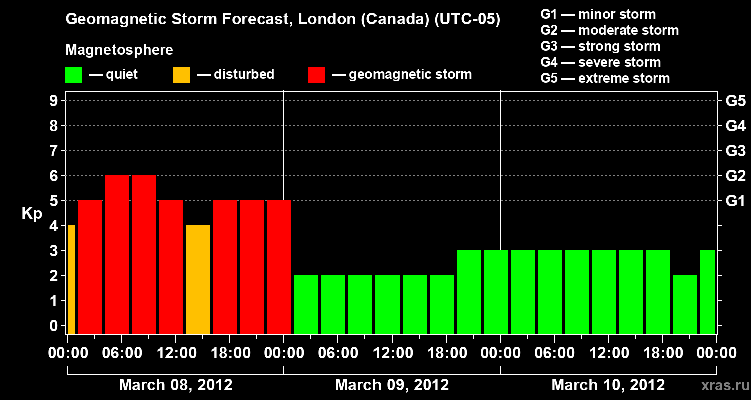 Geomagnetic storm forecast in London (Canada) for Mar 08, 2012