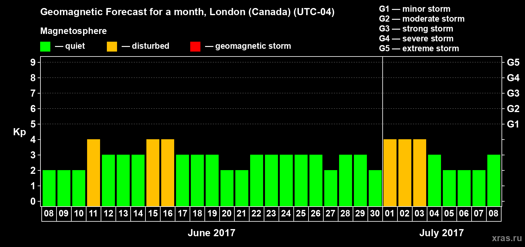 Geomagnetic storm forecast in London (Canada) for Jun 08, 2017