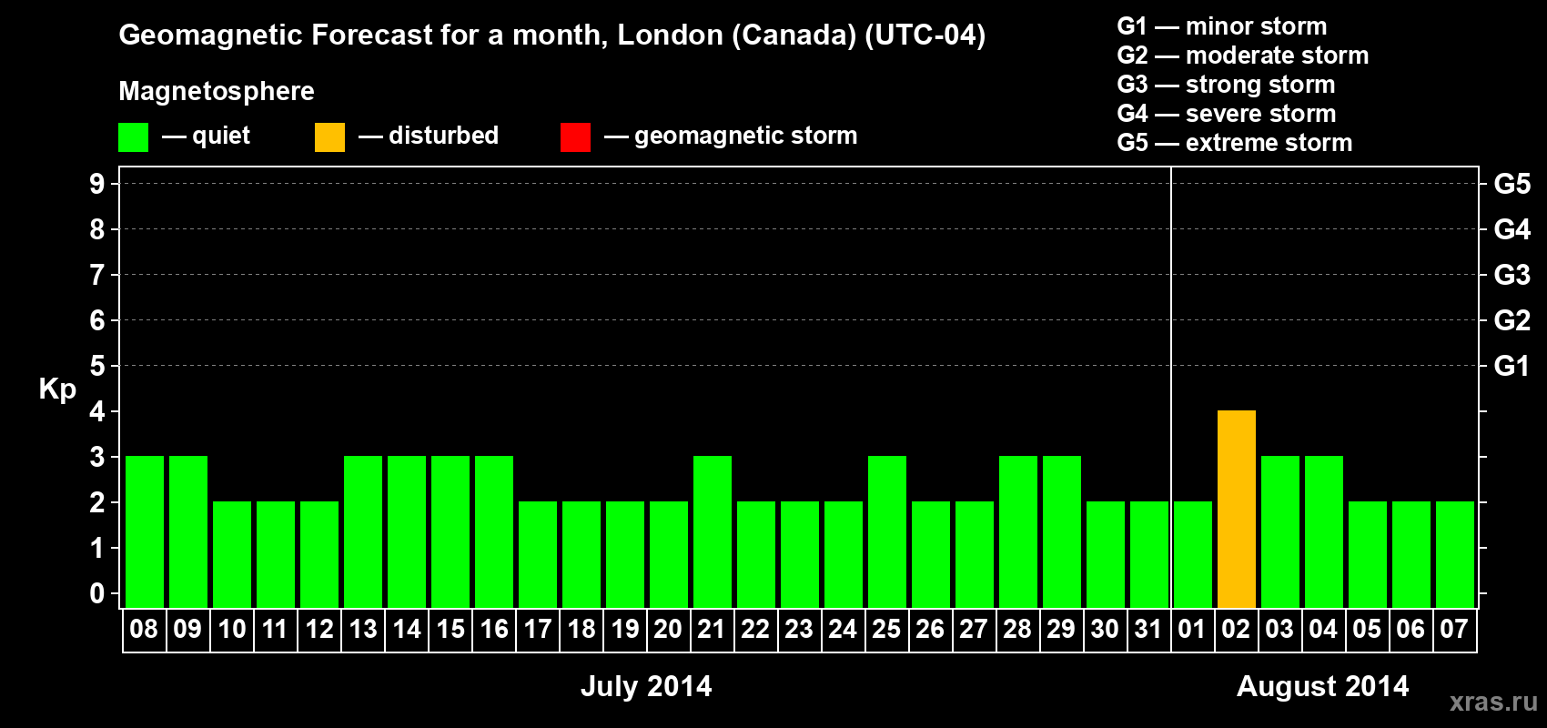 Geomagnetic storm forecast in London (Canada) for Jul 08, 2014