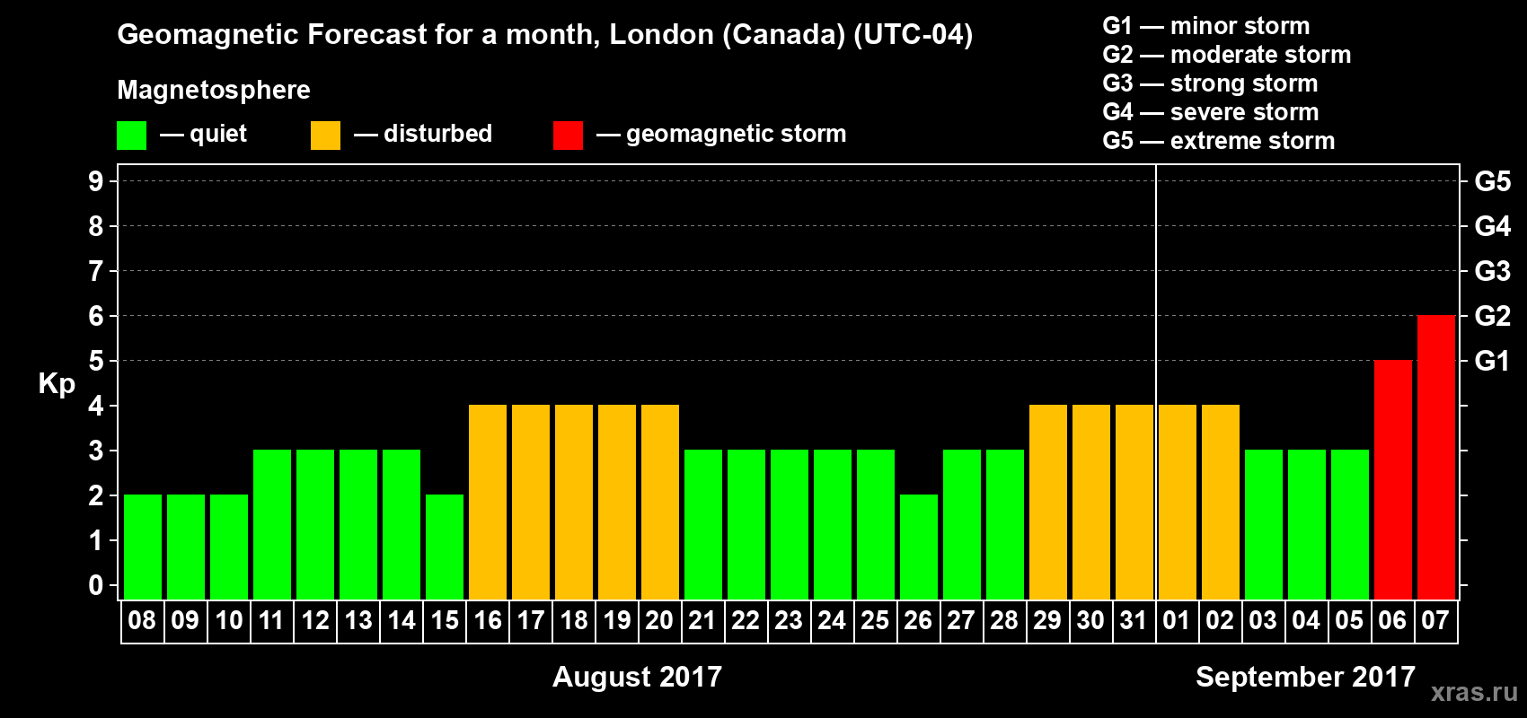 Geomagnetic storm forecast in London (Canada) for Aug 08, 2017