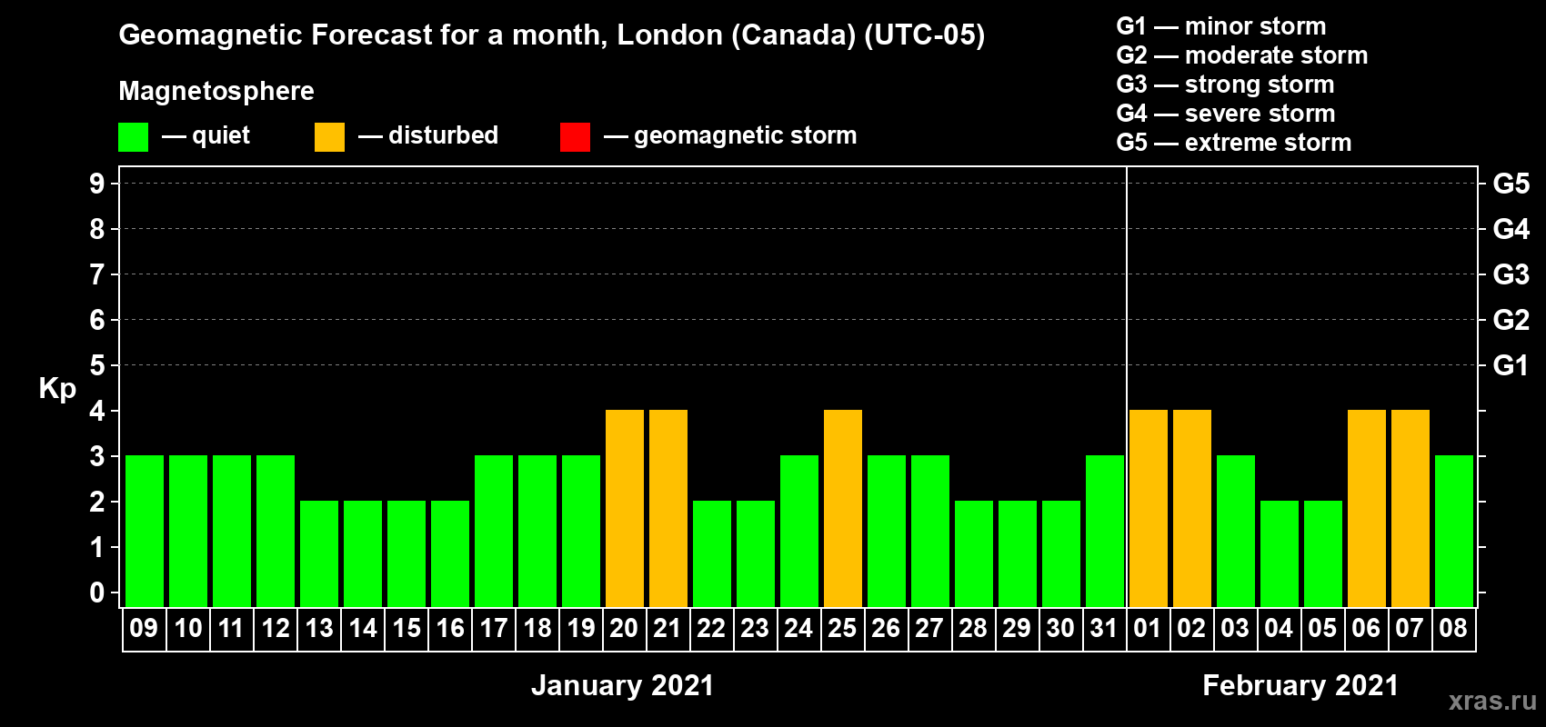 Geomagnetic storm forecast in London (Canada) for Jan 09, 2021