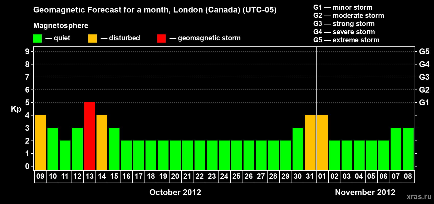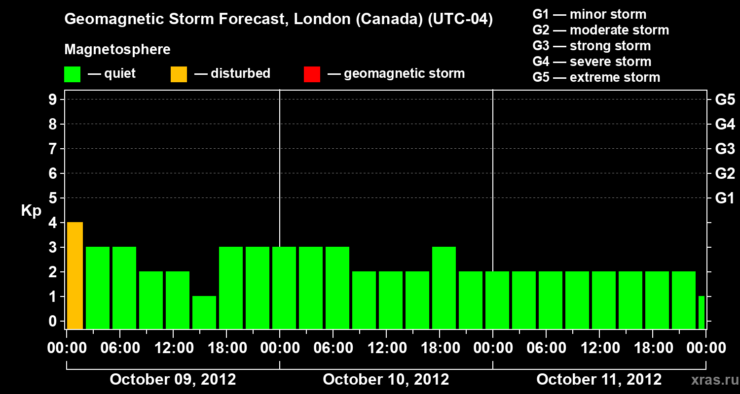 Geomagnetic storm forecast in London (Canada) for Oct 09, 2012