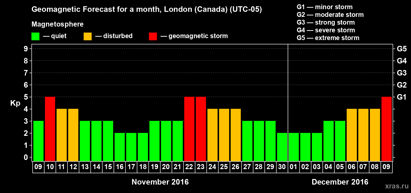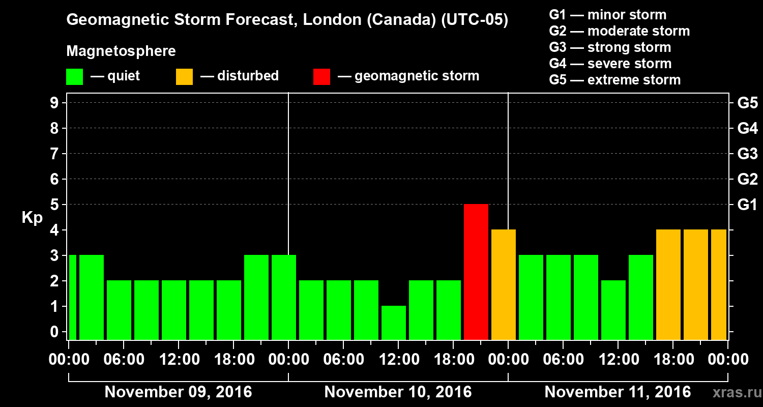 Geomagnetic storm forecast in London (Canada) for Nov 09, 2016