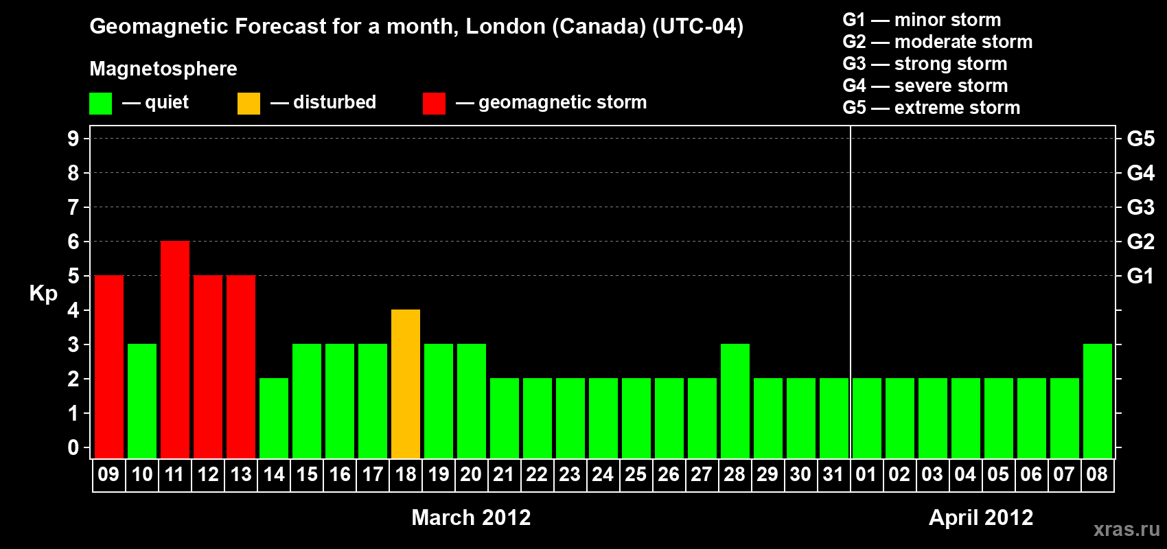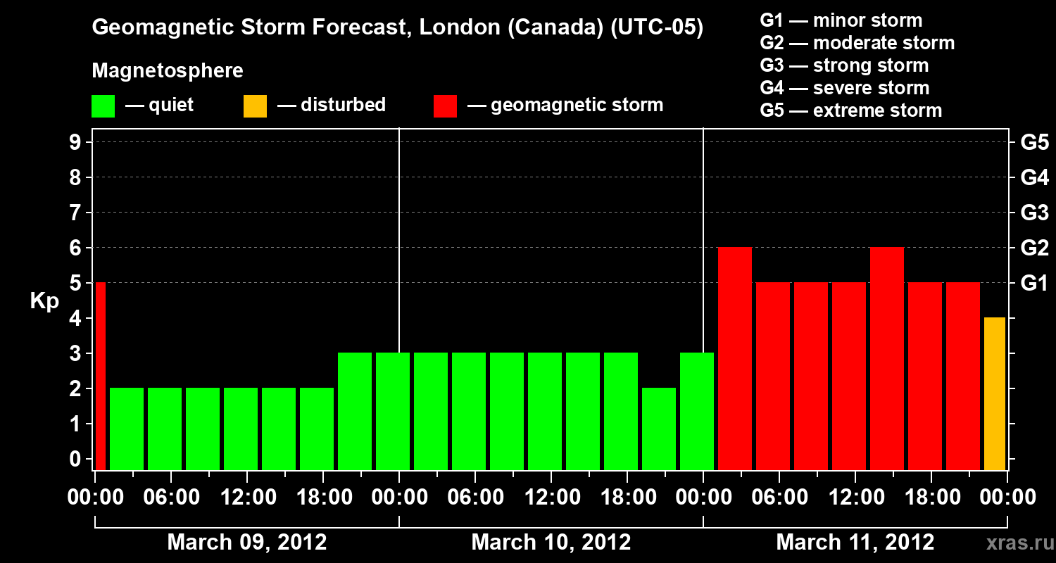 Geomagnetic storm forecast in London (Canada) for Mar 09, 2012