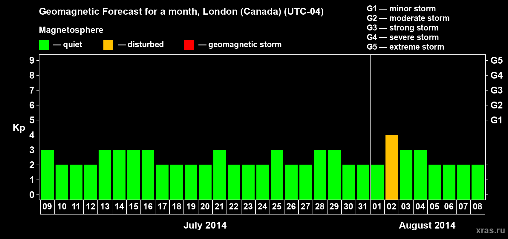 Geomagnetic storm forecast in London (Canada) for Jul 09, 2014