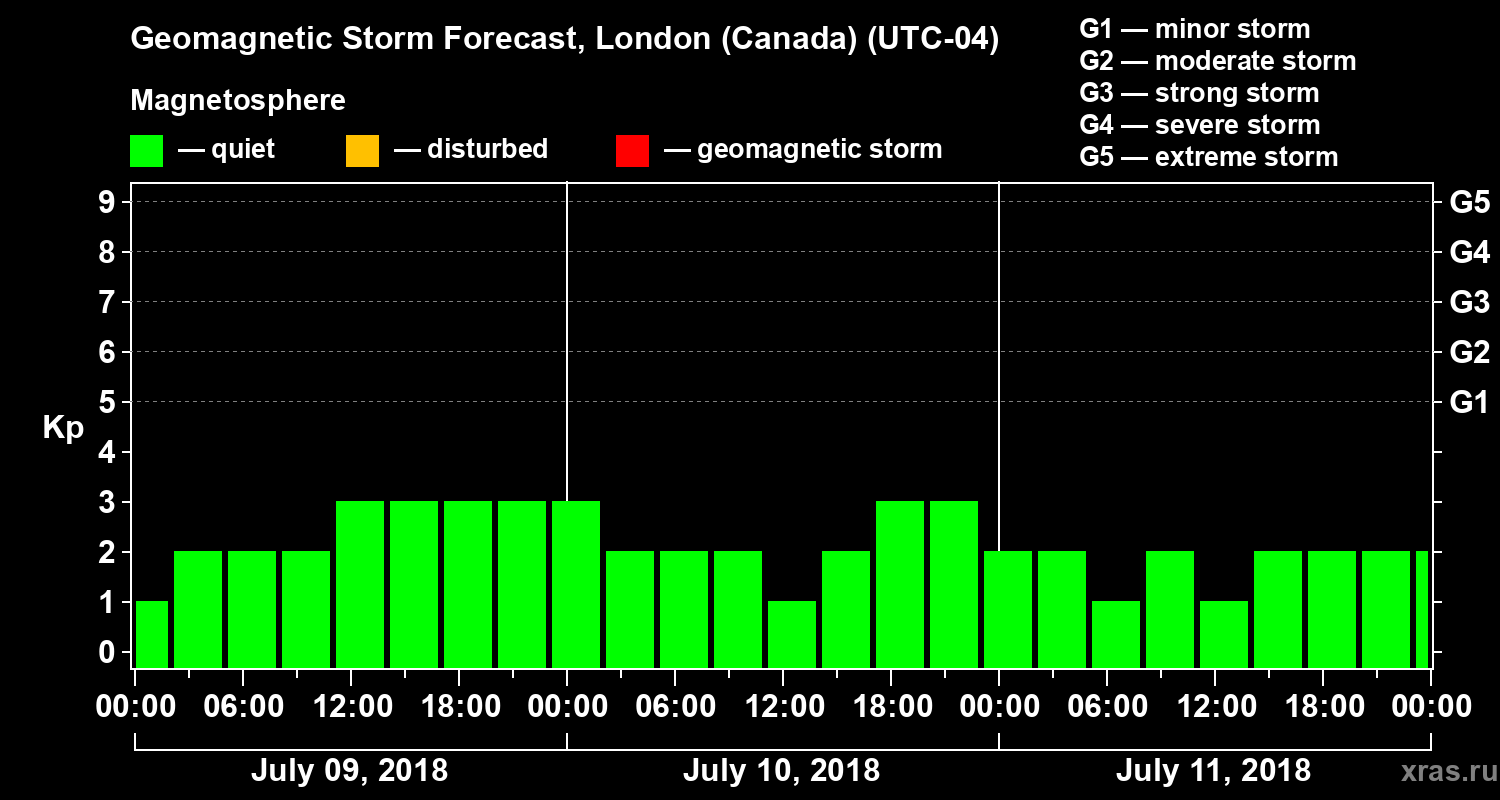 Geomagnetic storm forecast in London (Canada) for Jul 09, 2018