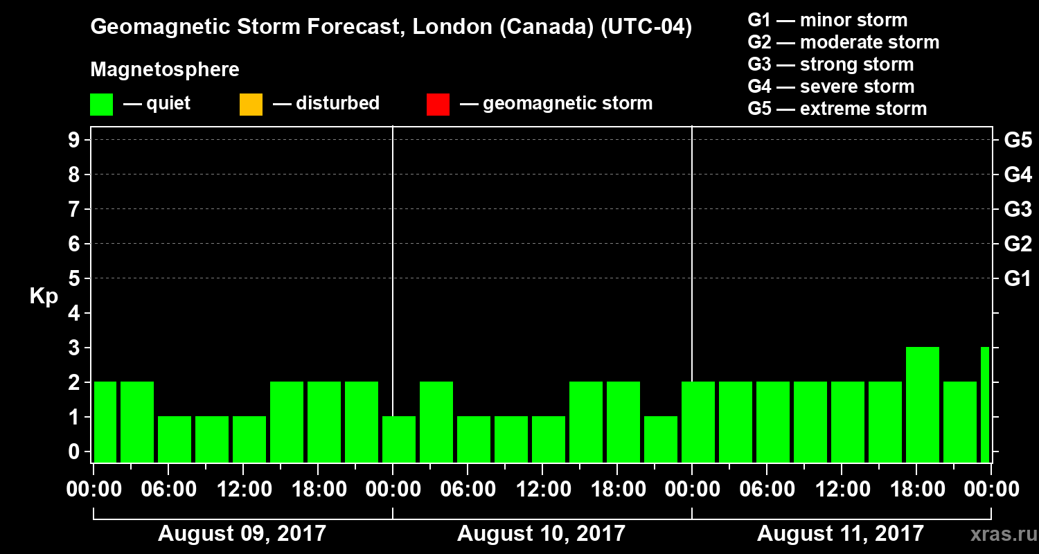 Geomagnetic storm forecast in London (Canada) for Aug 09, 2017