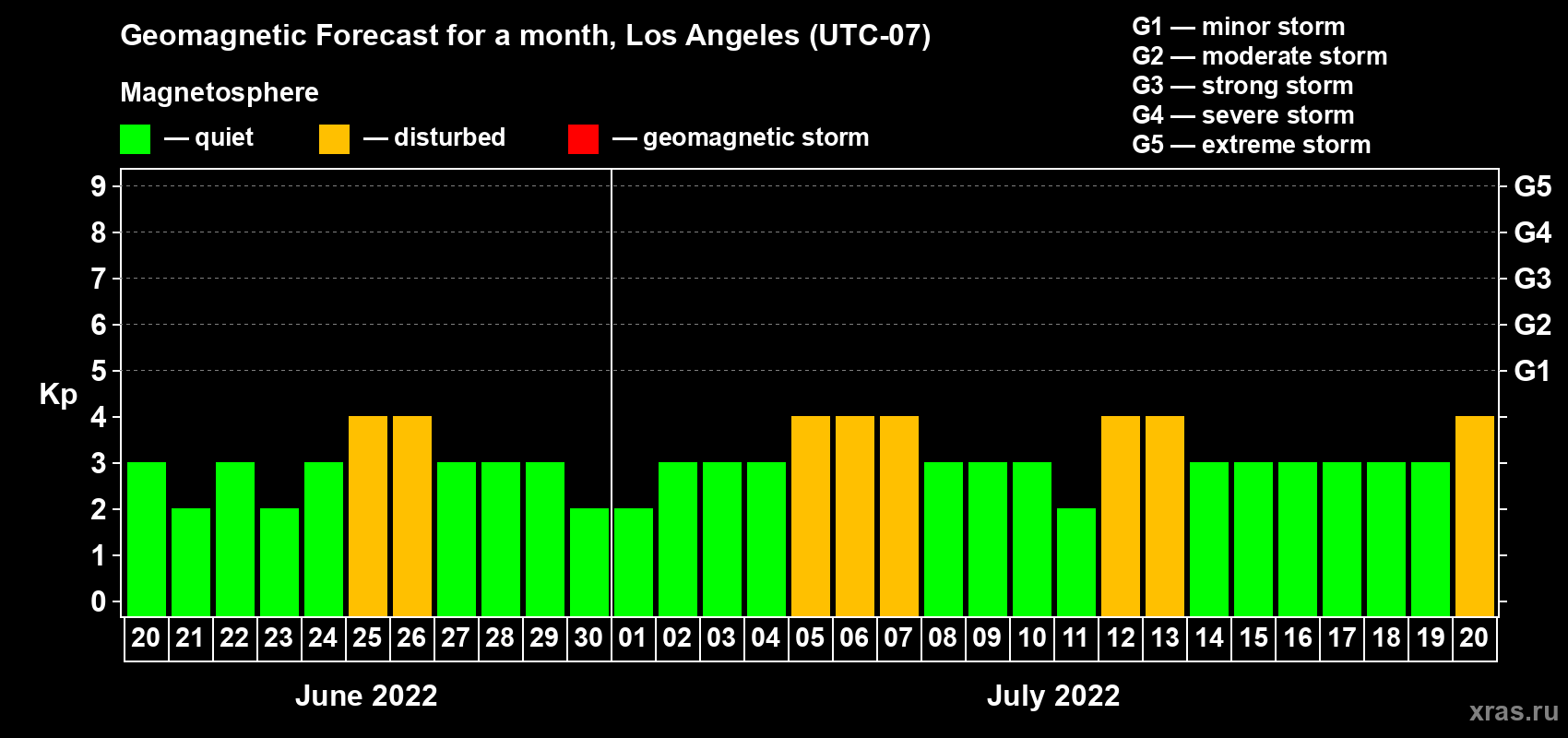 Geomagnetic storm forecast in Los Angeles for Jun 20, 2022