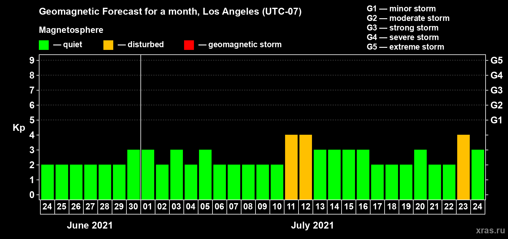 Geomagnetic storm forecast in Los Angeles for Jun 24, 2021