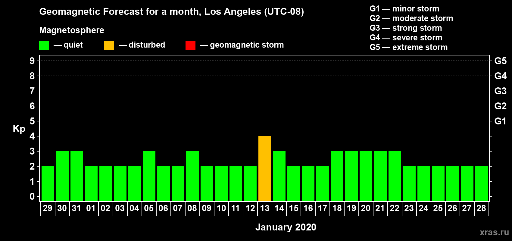 Geomagnetic storm forecast in Los Angeles for Dec 29, 2019