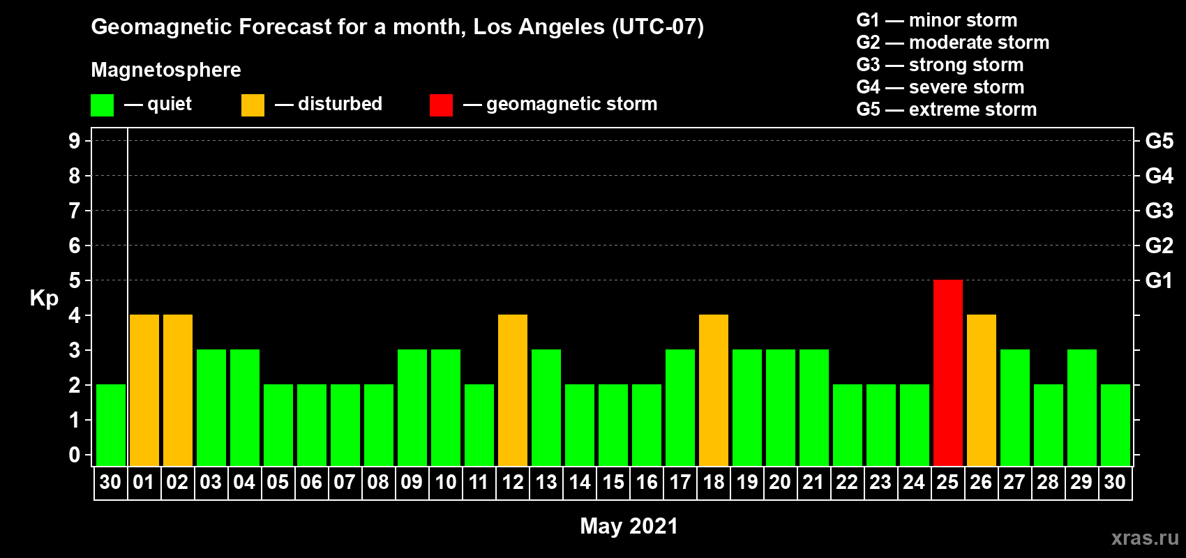 Geomagnetic storm forecast in Los Angeles for Apr 30, 2021