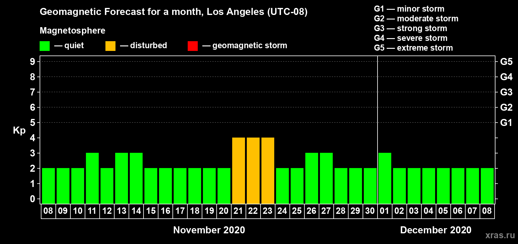 Geomagnetic storm forecast in Los Angeles for Nov 08, 2020