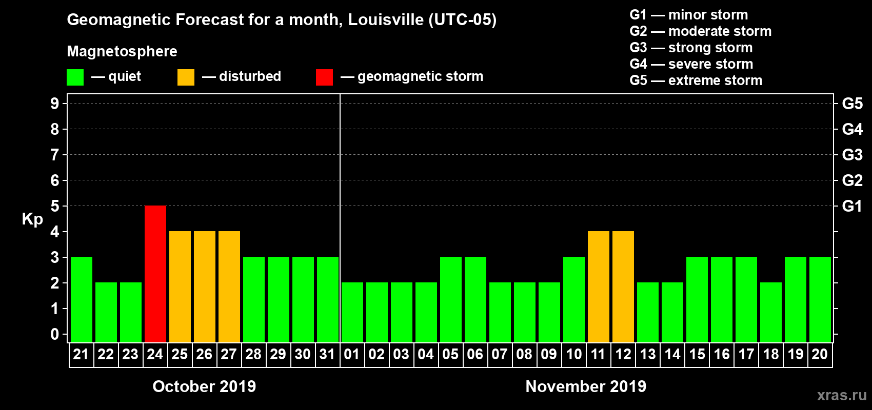 Geomagnetic storm forecast in Louisville for Oct 21, 2019