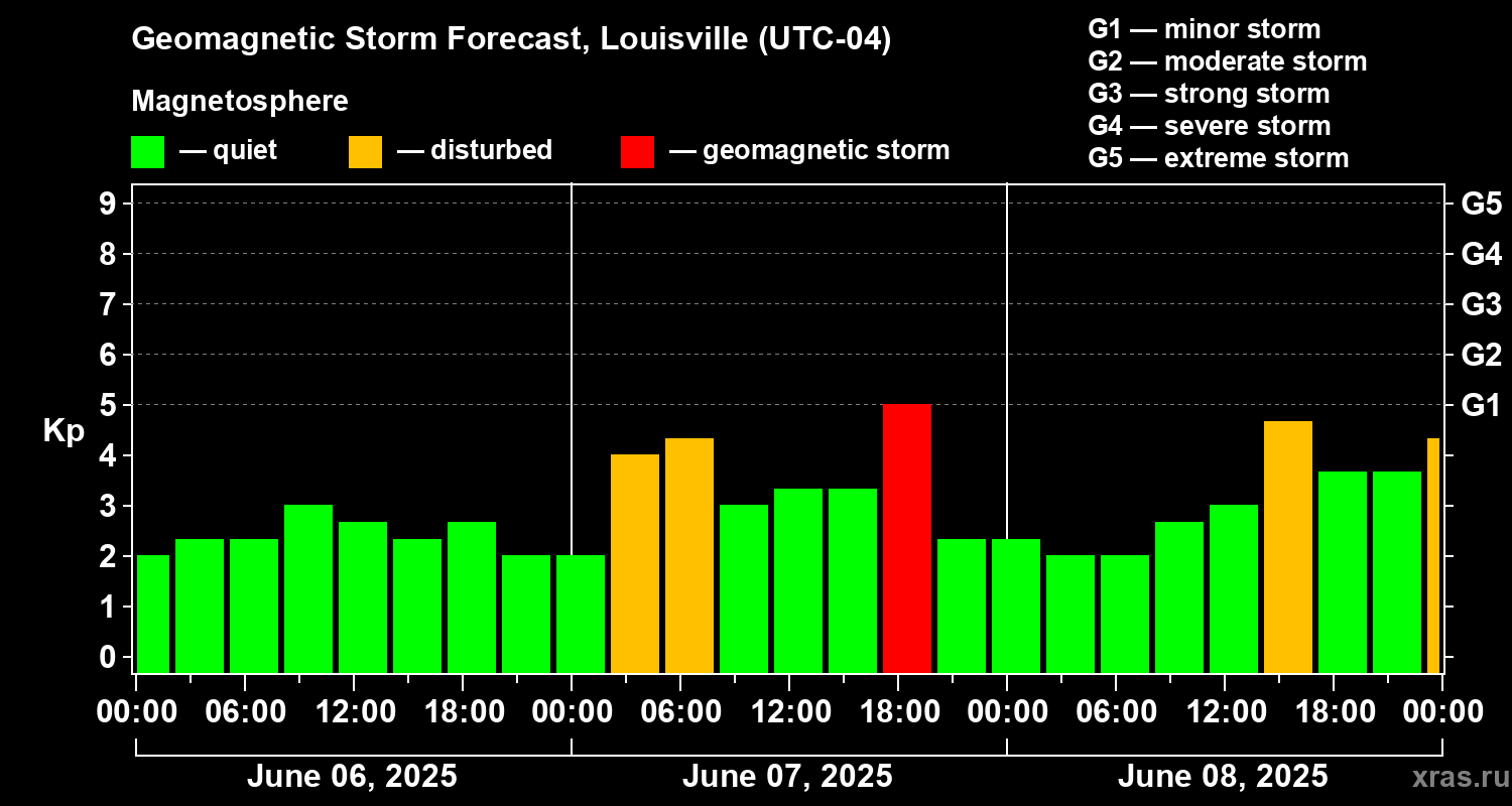 Geomagnetic storm forecast in Louisville for Jun 06, 2025