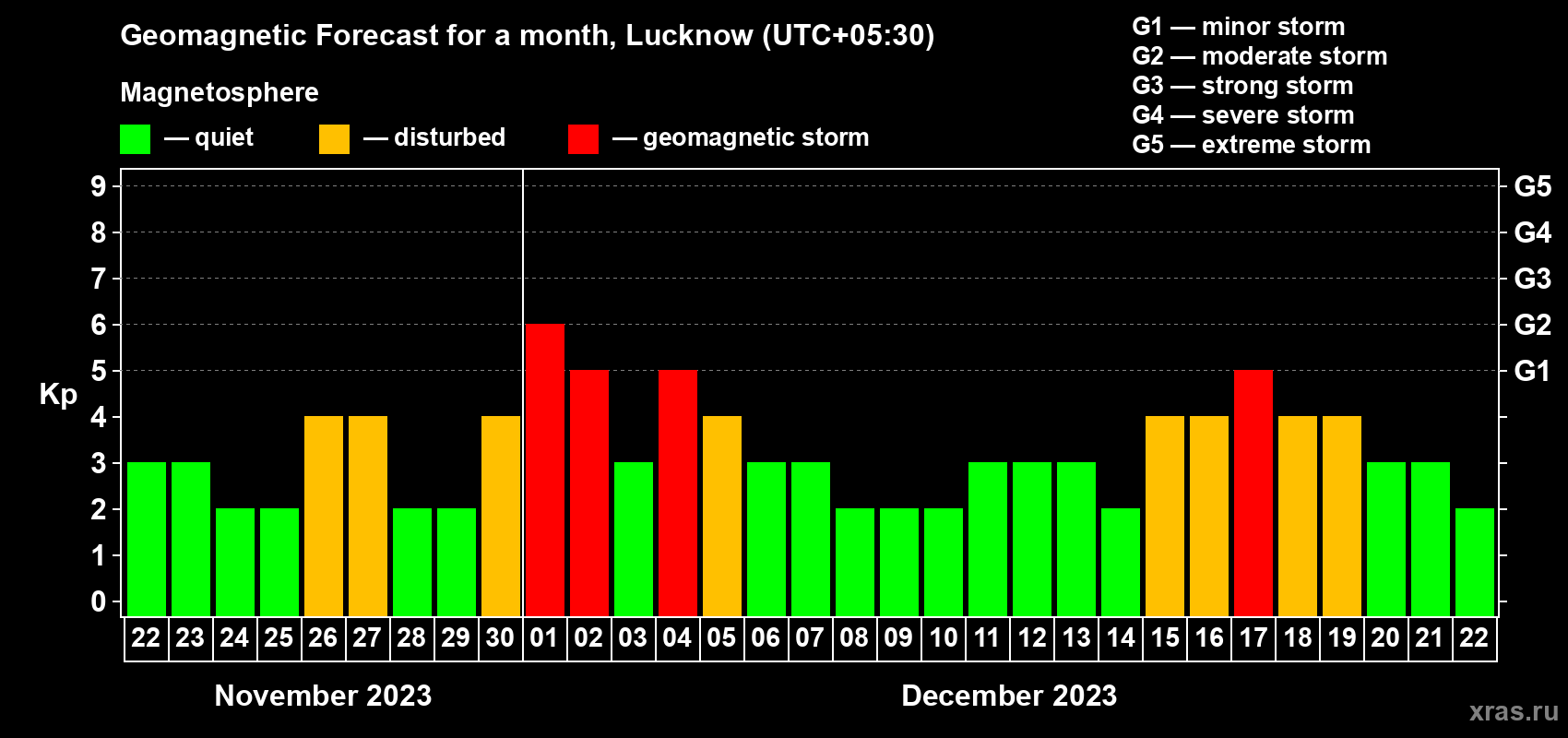 Geomagnetic storm forecast in Lucknow for Nov 22, 2023