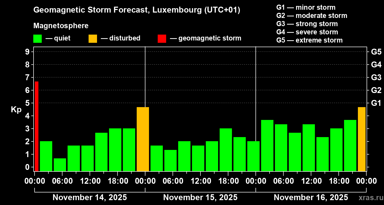 Geomagnetic storm forecast in Luxembourg for Nov 14, 2025