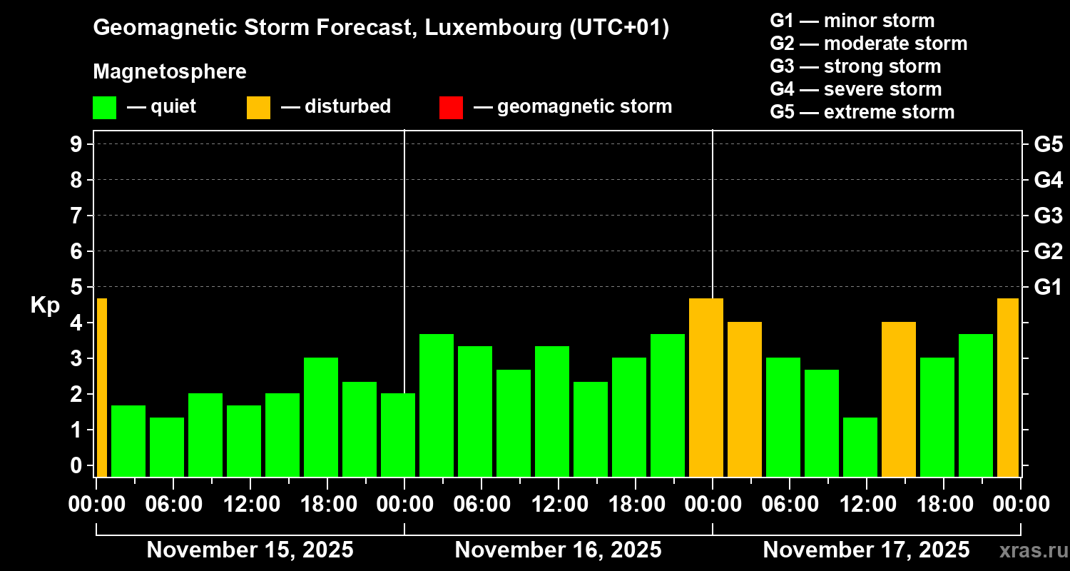 Geomagnetic storm forecast in Luxembourg for Nov 15, 2025