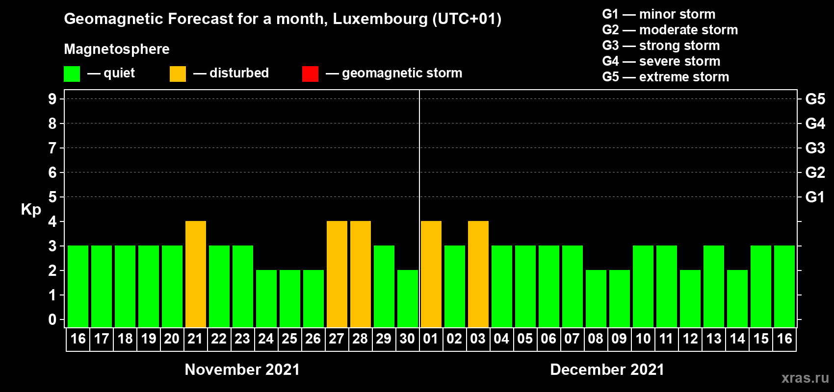 Geomagnetic storm forecast in Luxembourg for Nov 16, 2021